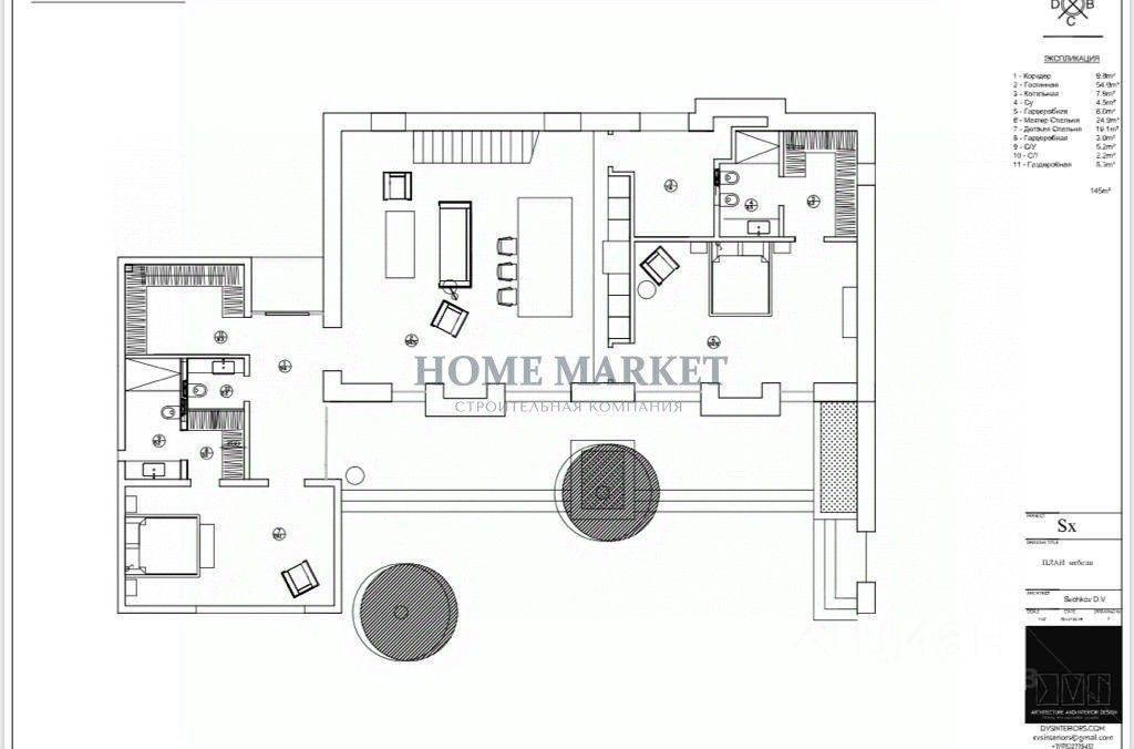 1 этаж: холл, просторная кухня-гостиная (54 кв.м) со вторым светом и с выходом на большую террасу, мастер-спальня 24.9 кв.м. с ванной комнатой и гардеробной, гостевая спальня, гардеробная, санузел, вместительная кладовая, котельная 7.5 кв.м.,