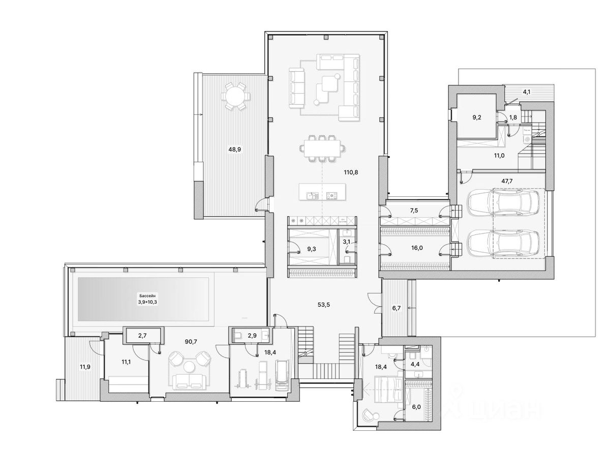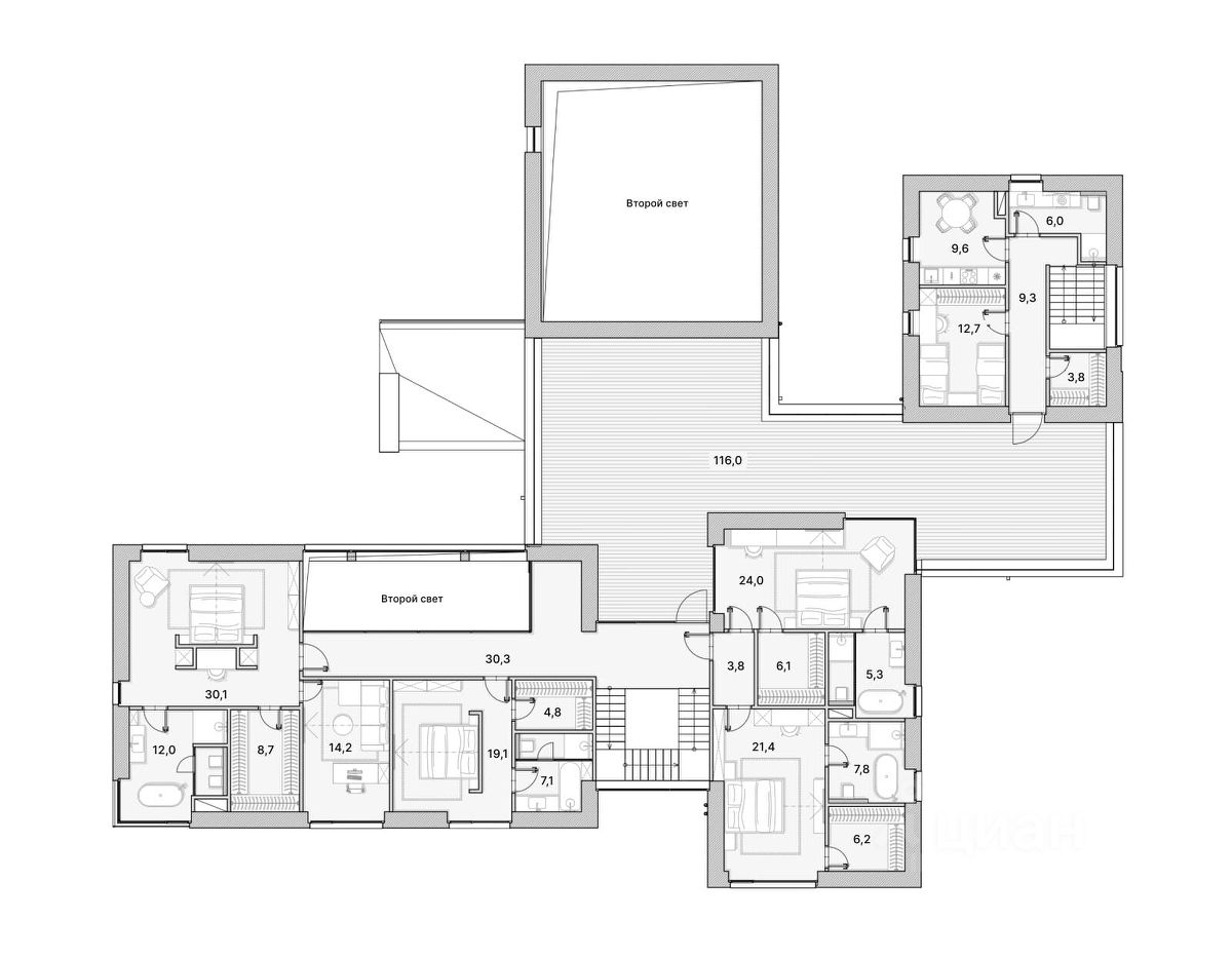 Дом сдается со свободной планировкой (формат shell & core) — внутри нет перегородок и отделки, заведены все инженерные коммуникации.