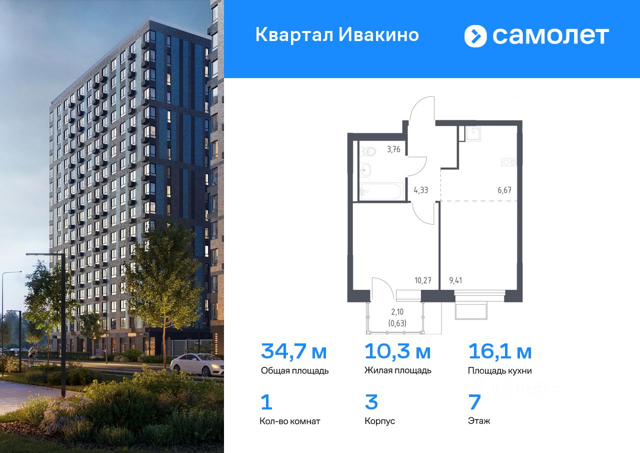 Предлагается 1-комнатная квартира комфорт-класса 34,7 кв.м в корпусе 3 на 7 этаже, в ЖК ''Квартал Ивакино'' Квартира с чистовой отделкой. Доступность дополнительных опций уточняйте у застройщика.