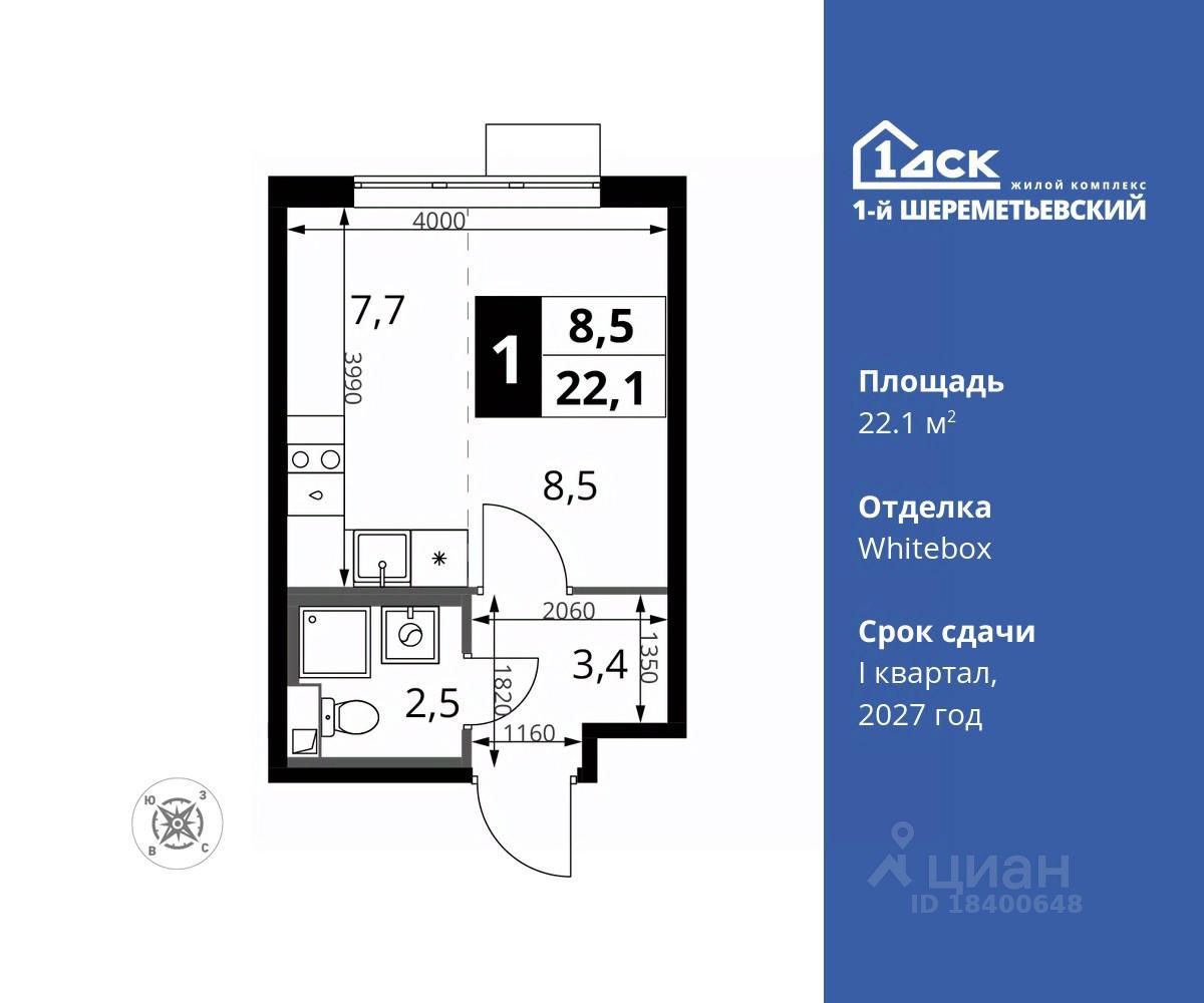 Максимальные скидки при 100% оплате. Прямая продажа от застройщика! Жилой Комплекс класса Комфорт плюс. Продаётся студия номер 838 общей площадью 22.1 кв.м на 13-м этаже 16 этажного дома. Отделка Whitebox.