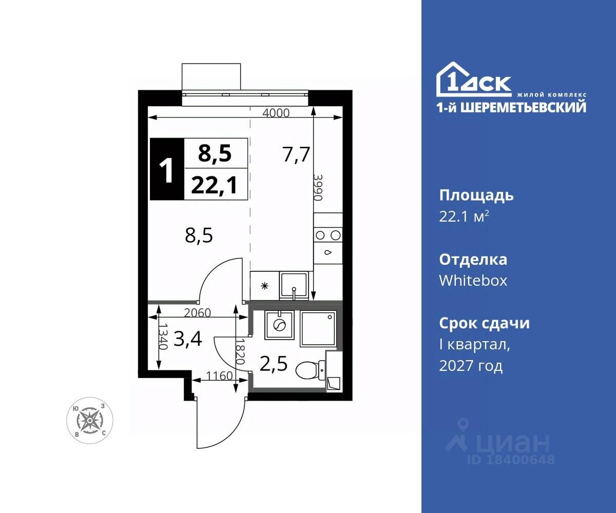 Максимальные скидки при 100% оплате. Прямая продажа от застройщика! Жилой Комплекс класса Комфорт плюс. Продаётся студия номер 764 общей площадью 22.1 кв.м на 13-м этаже 16 этажного дома. Отделка Whitebox.