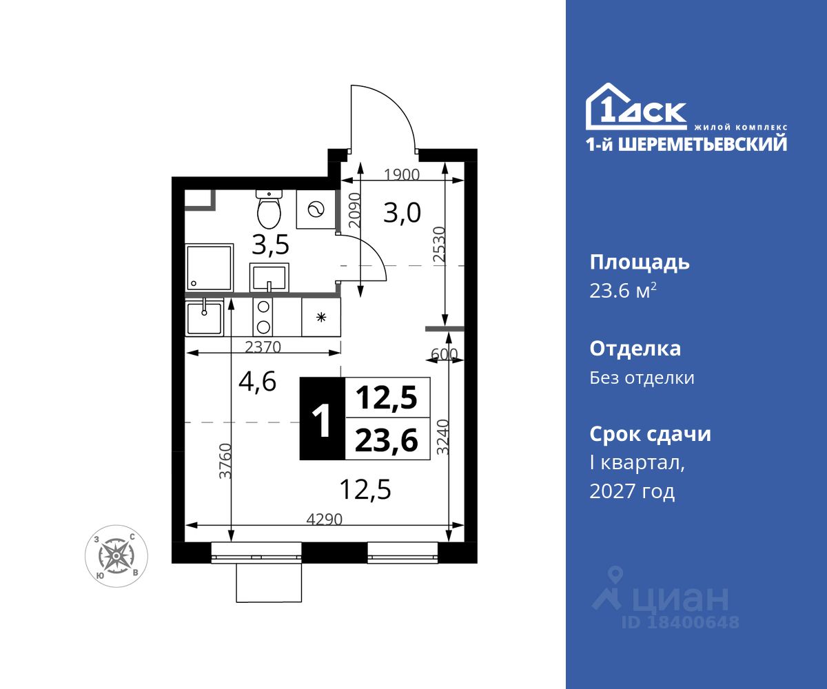 Максимальные скидки при 100% оплате. Прямая продажа от застройщика! Жилой Комплекс класса Комфорт плюс. Продаётся студия номер 1226 общей площадью 23.6 кв.м на 6-м этаже 17 этажного дома. Без отделки.