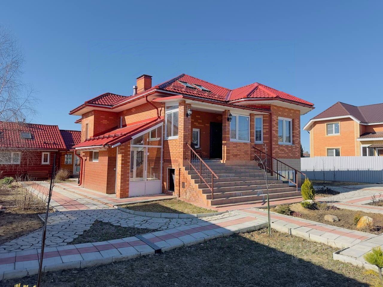 Описание: Площадь дома составляет 161 кв.м., он включает в себя первый этаж и жилой цокольный этаж. Дом находится в состоянии под чистовую отделку, что позволит вам реализовать свои дизайнерские идеи. Участок организован и обустроен, сделан автоматический полив участка. Двор выложен брусчаткой. Во дворе стоянка для машин, установлены автоматические откатные ворота. Планировка: Основной дом: 1 этаж - мастер спальня, кухня-гостиная, кладовая, холл, санузел. Цокольный этаж - 2 спальни, санузел, холл, котельная Гостевой дом: кухня-гостинная, санузел, холл, кладовая. Дом-баня: кухня-гостинная, парилка, санузел, летняя веранда застекленная.