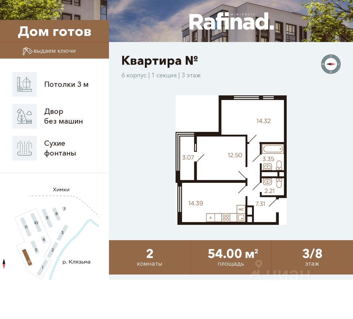 Продаётся 2-комнатная квартира общей площадью 54.00 м² на 3 этаже.
