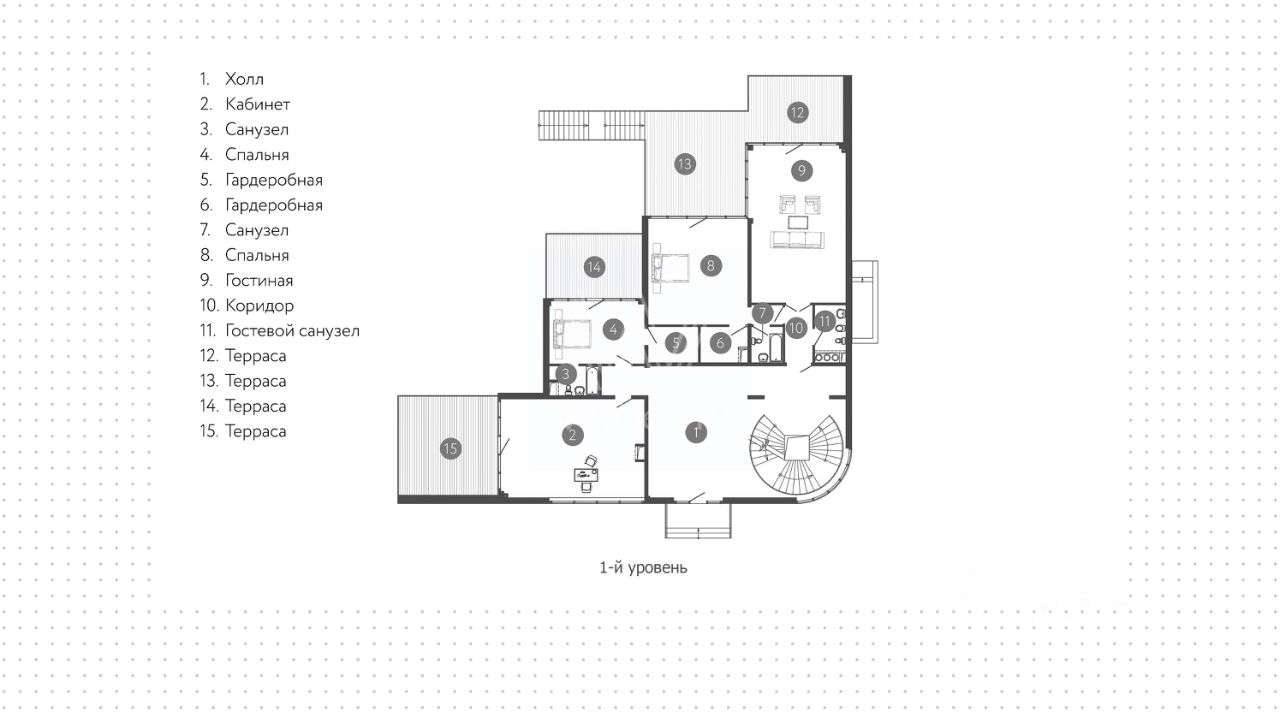 1-й уровень: холл, гостиная, санузел, кабинет, 2 спальни с гардеробными и санузлами, 3 террасы.