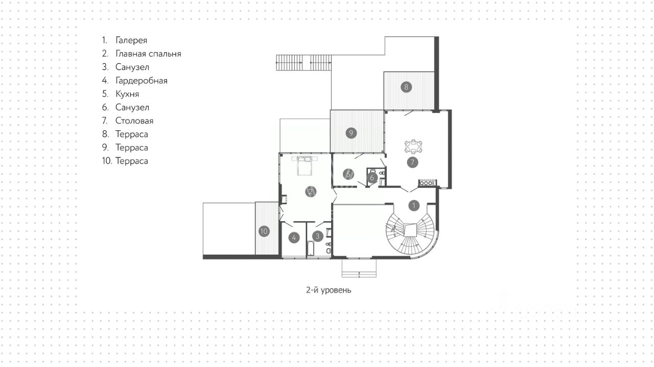 2-й уровень: галерея, кухня, столовая, санузел, 2 террасы, мастер-спальня с гардеробной, санузлом и террасой.