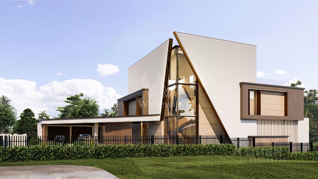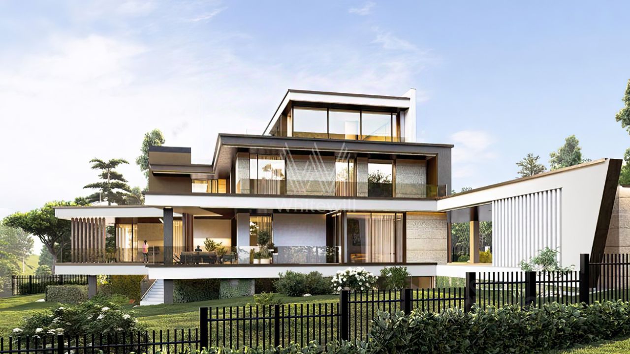 Планировка включает гостиную с возможностью установки камина, кухню, столовую, 3 спальни с гардеробными, кабинет, тренажерный зал и несколько террас, выход на которые доступен с каждого этажа. Дополнительно на территории предусмотрен гараж на 2 машины. Участок с аккуратным газоном открывает широкий потенциал для создания собственного ландшафтного проекта — можно дополнить участок тенистыми деревьями, декоративными кустарниками и цветниками, проложить изящные садовые дорожки и создать уютную зону для барбекю.