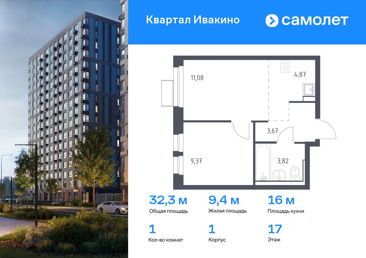 Предлагается 1-комнатная квартира комфорт-класса 32,3 кв.м в корпусе 1 на 17 этаже, в ЖК ''Квартал Ивакино'' Квартира с чистовой отделкой. Доступность дополнительных опций уточняйте у застройщика.