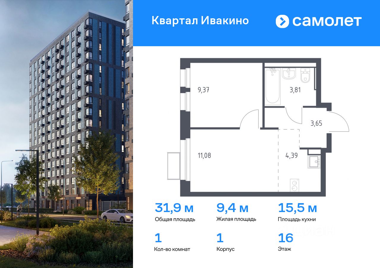 Предлагается 1-комнатная квартира комфорт-класса 31,9 кв.м в корпусе 1 на 16 этаже, в ЖК ''Квартал Ивакино'' Квартира с чистовой отделкой. Доступность дополнительных опций уточняйте у застройщика.