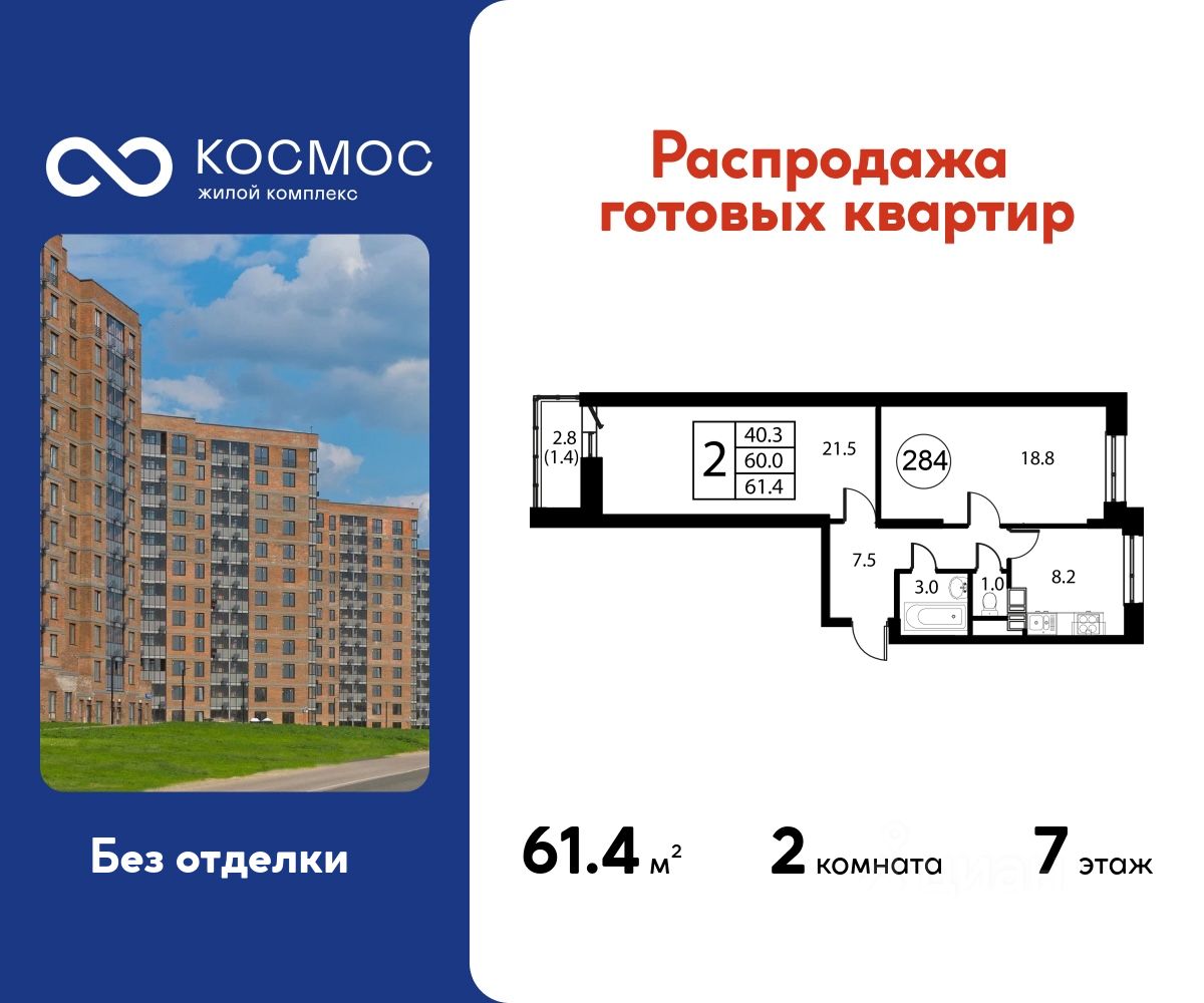 Продаётся 2-комнатная квартира в сданном доме (Корпус 7), срок сдачи: 2-кв. 2025, общей площадью 61.40 кв.м., на 7 этаже.