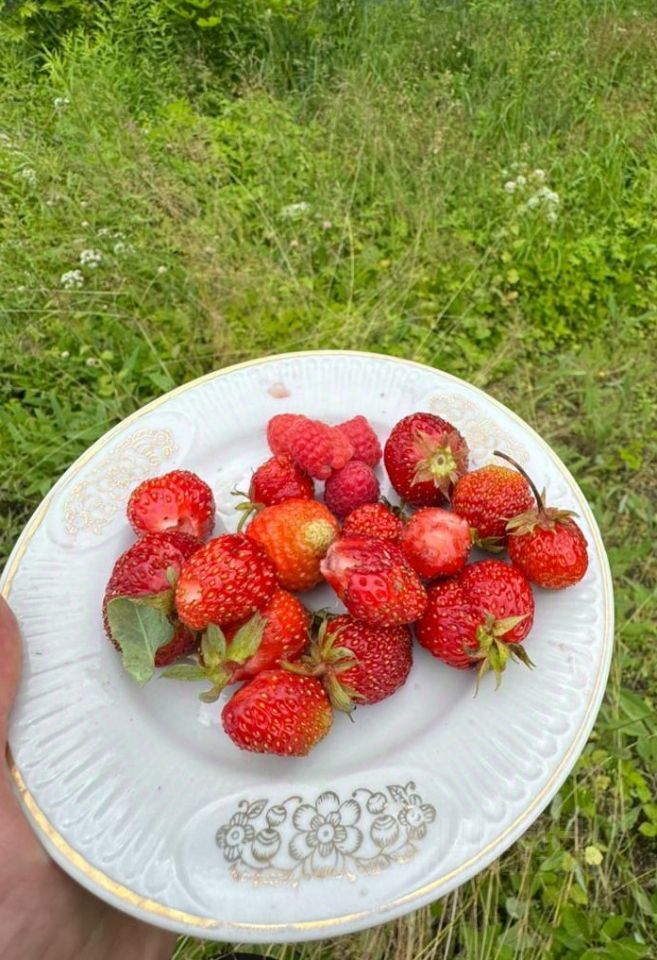 На участке растут плодовые деревья и ягоды.