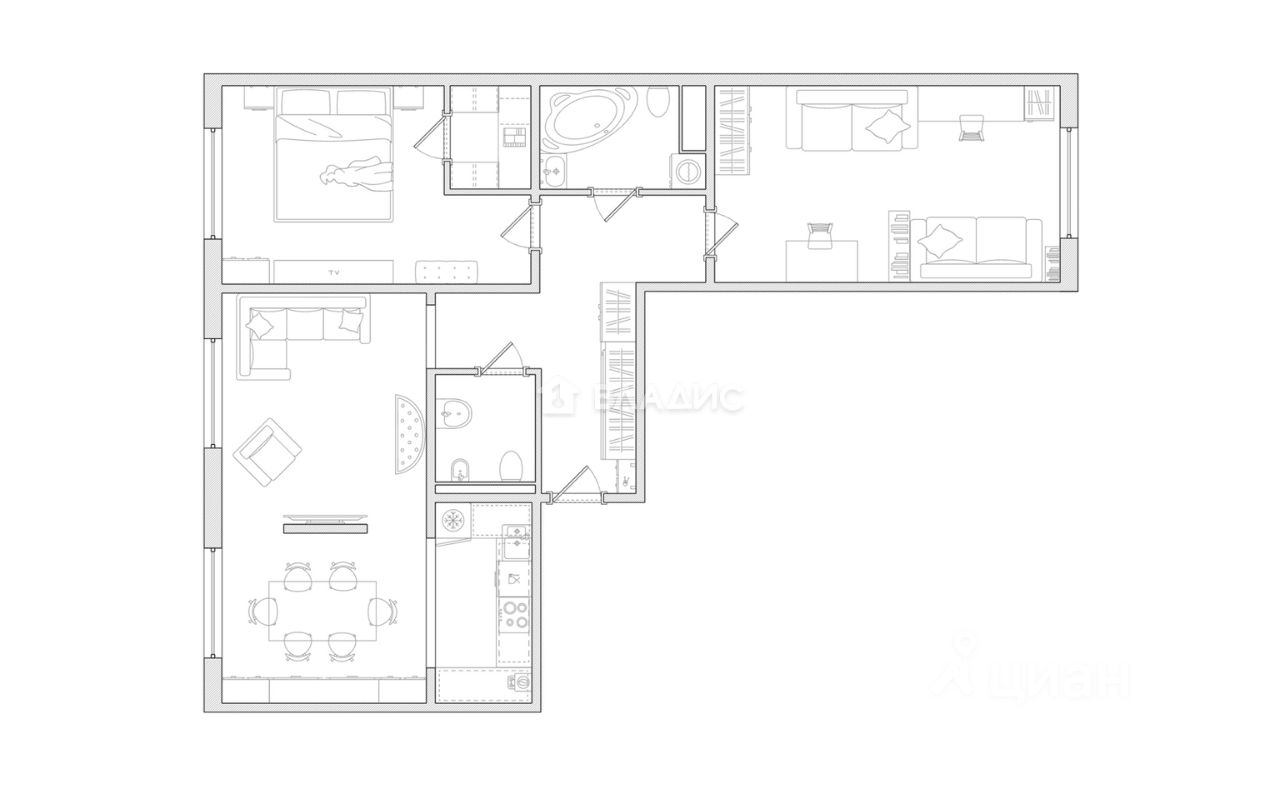 Мебель частично остаётся новым владельцам, все нюансы оговариваются при встрече • Две изолированные комнаты: 20,3 м² и 18,2 м² • Зона кухни 5,8 м² • Гостиная 24 м² • Коридор-прихожая 8,9 м² • Два санузла: совмещенный 4,3 м² и раздельный 2,2 м²