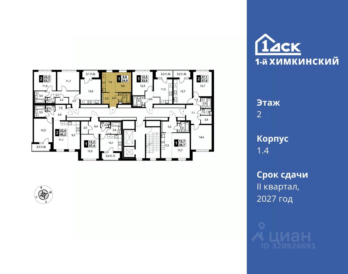 Семейная ипотека без наценки со скидками до 21% до конца августа! Прямая продажа от застройщика! Жилой Комплекс класса Комфорт. Продаётся студия номер 438 общей площадью 24.9 кв.м на 2-м этаже 14 этажного дома. Отделка Whitebox.