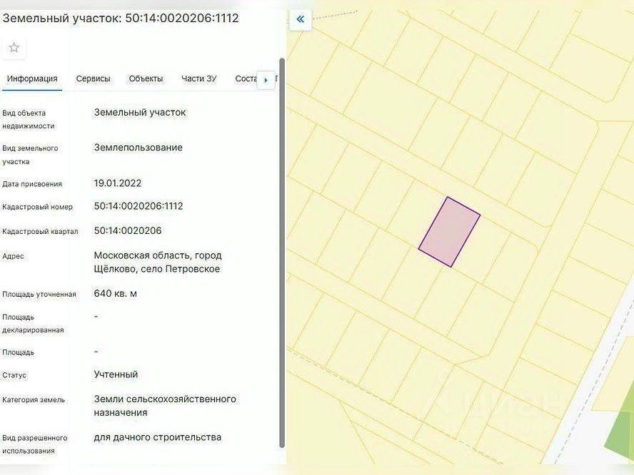 АУКЦИОН. Объект реализуется через электронный аукцион с 2026-01-01 по 2026-01-31 Имущество реализуется путем проведения торгов в форме аукциона в соответствии с Федеральным законом ''О несостоятельности (банкротстве) '' от 26.10.2002 127-ФЗ. Земельный участок площадью 640 мкадастровый номер: 50: 14: 0020206: 1112Категория земель: Земли сельскохозяйственного назначенияВид разрешенного использования: Для дачного строительствапо адресу: Московская область, г. Щёлково, с. Петровскоекоординаты: 56.09038011, 38.2430374 Прием заявок на электронной торговой площадке ''ЦДТ'', задаток 10%. Помощь от Сбербанка - Агентский сервис по участию на торгах. Агент за Вас оформит документы, подаст заявку и примет участие на торгах. Подробнее о способах оформления сделки, стоимости приобретения имущества Вы можете узнать по номеру телефона, указанному в объявлении, в будние дни с 09: 00 до 18: 00 (по времени МСК, GMT+3) , также на сайте активов Банка Portal-DA.