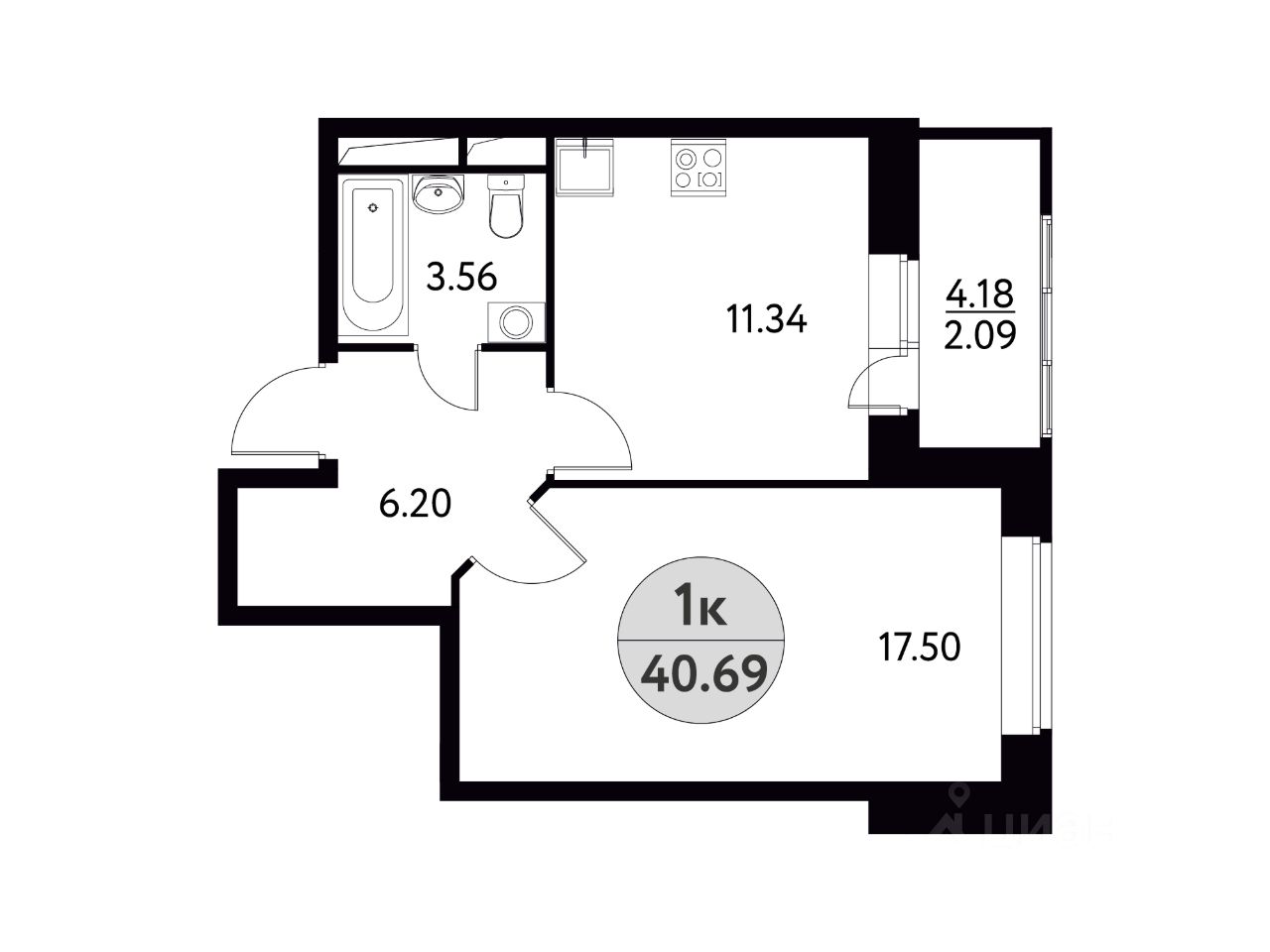 Общая площадь40,69 м2