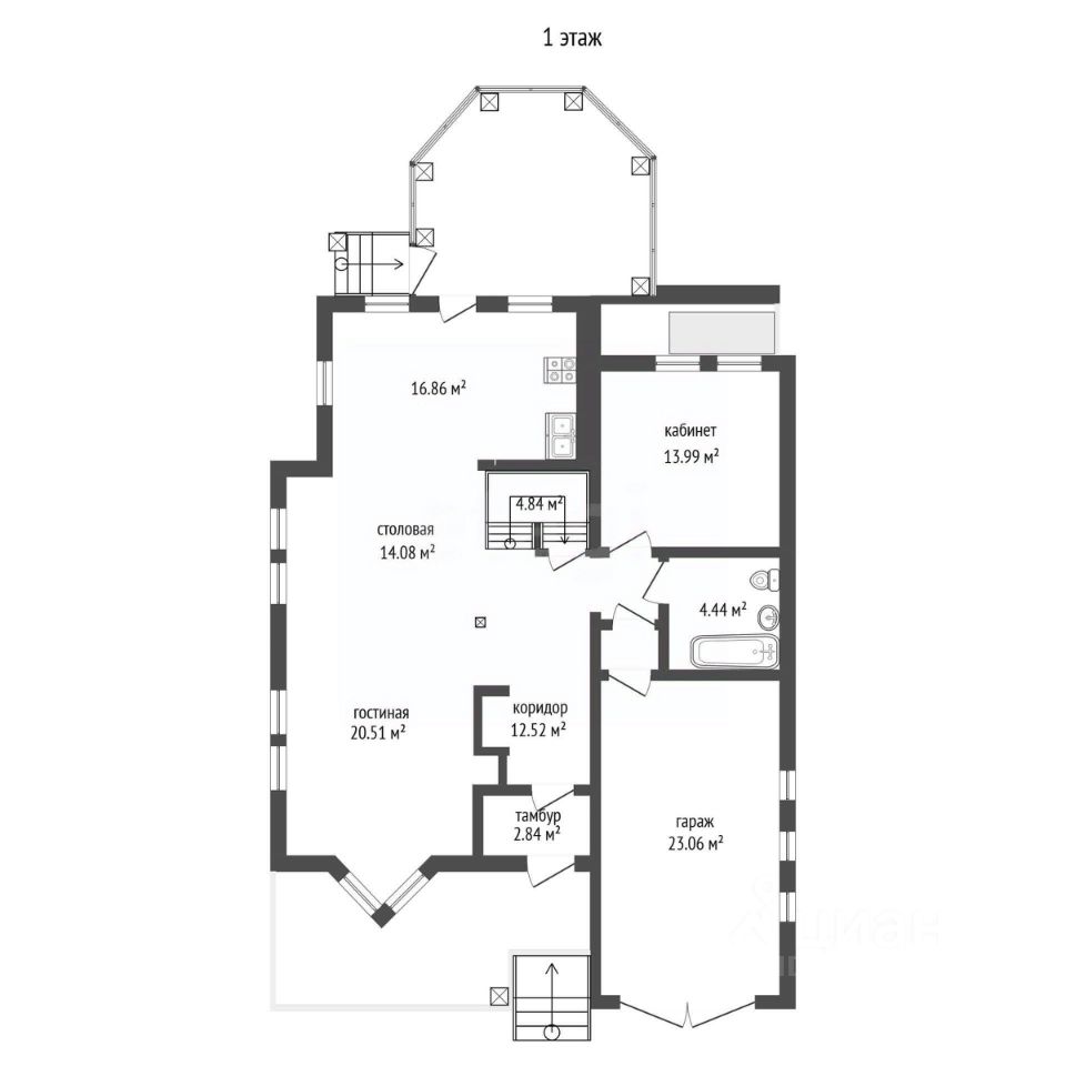 На первом этаже функциональные зоны грамотно связаны между собой: гостиная, объединённая с кухней и выходом в зимний сад, формирует просторное общесемейное пространство для отдыха и приёма гостей, рядом расположен отдельный кабинет для работы и учёбы, а тёплый гараж с автоматическими воротами обеспечивает прямой и сухой доступ в дом в любую погоду. Наличие санузла на уровне гостевой зоны делает повседневное использование этажа максимально удобным.